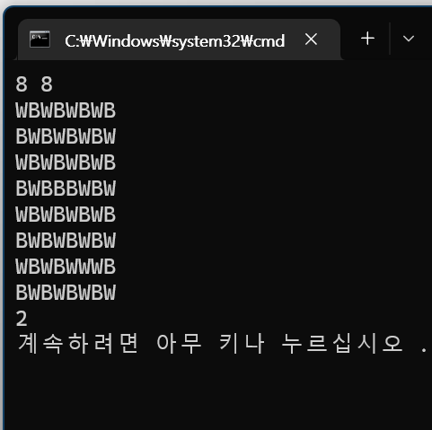 int cnt2 = 0; // 블랙 체스보드 기본형일 경우 다시칠해야할 사각형 숫자 초기화