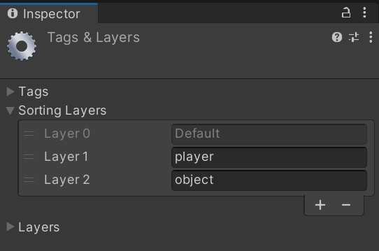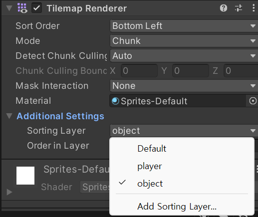이제 레이어 관련하여 얘기를 할때인데 우선 default 레이어에는 콜라이더 타일맵과 캐릭터와 부딪힐수 있는 레이어를 제외한 나머지 타일맵들을 순차적으로 넣어주었고 그 아래 플레이어 레이어를 넣어주고 그 위로 오브젝트 레이어를 생성해주었다.