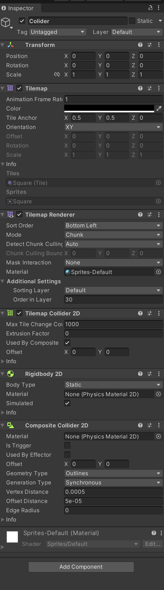 이후 아래와 해당 타일맵 오브젝트에 컴포넌트 들을 부착시킨다.