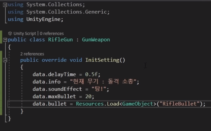 우선 GunWeapon 클래스를 상속받은 RifleGun 클래스 스크립트를 하나 생성한다.