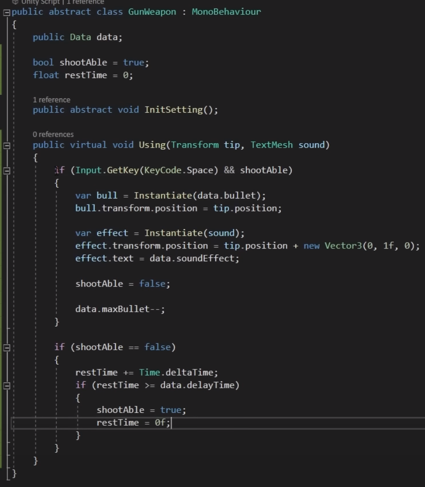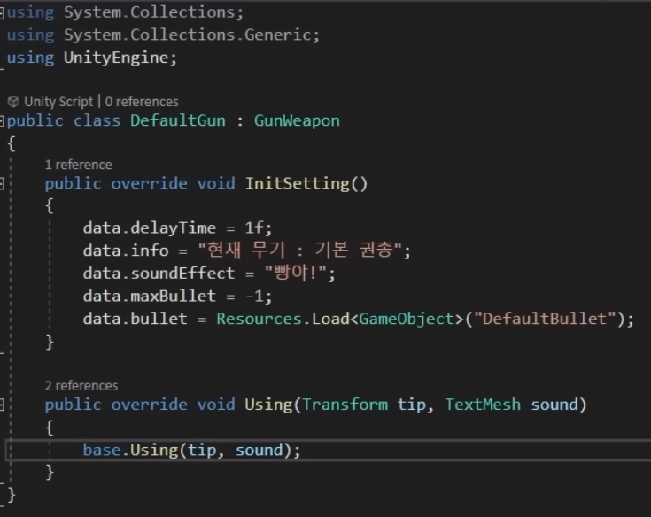 아래는 위에서 만든 추상클래스를 상속받은 DefaultGun 클래스 스크립트