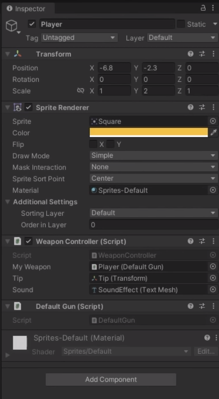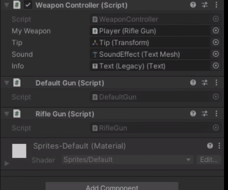 이제 위에서 만들어준 스크립트를 플레이어 오브젝트에 넣어주고 DefaultGun 클래스는 바로 넣어주는 것이 아니라 플레이어 오브젝트에 먼저 부착을 해준뒤 인스펙터 창에서 끌어다가 할당 해주면 된다.