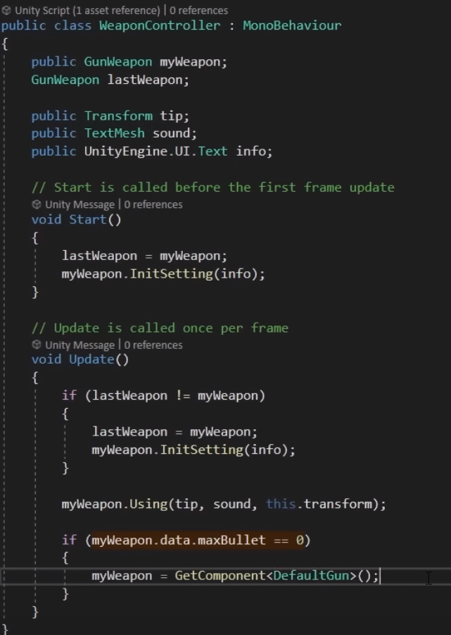 아래는 위에서 만들어준 스크립트를 사용할 WeaponController 모노 스크립트