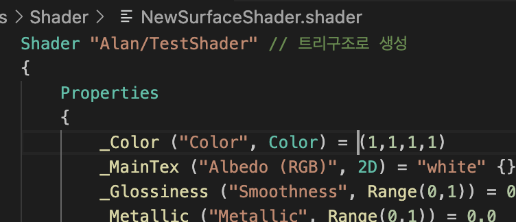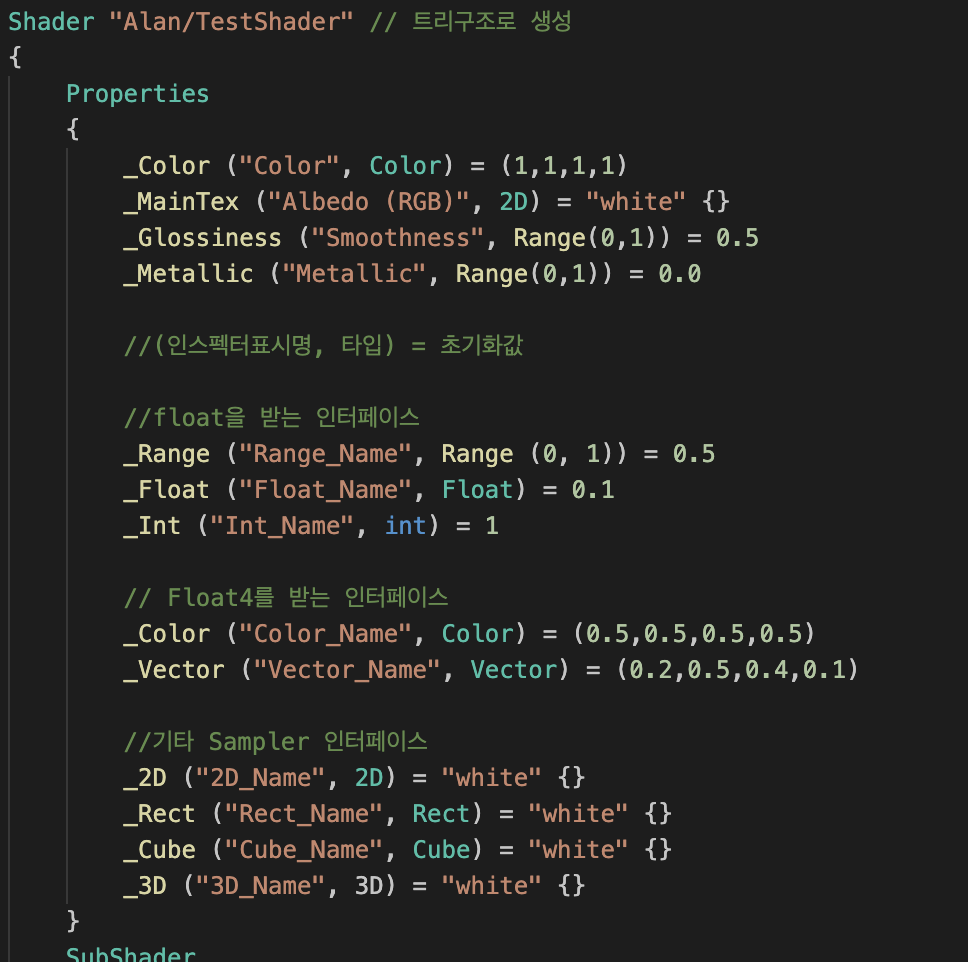 - 쉐이더의 프로퍼티 영역에서는 세미콜론(;)은 사용되지 않는다.